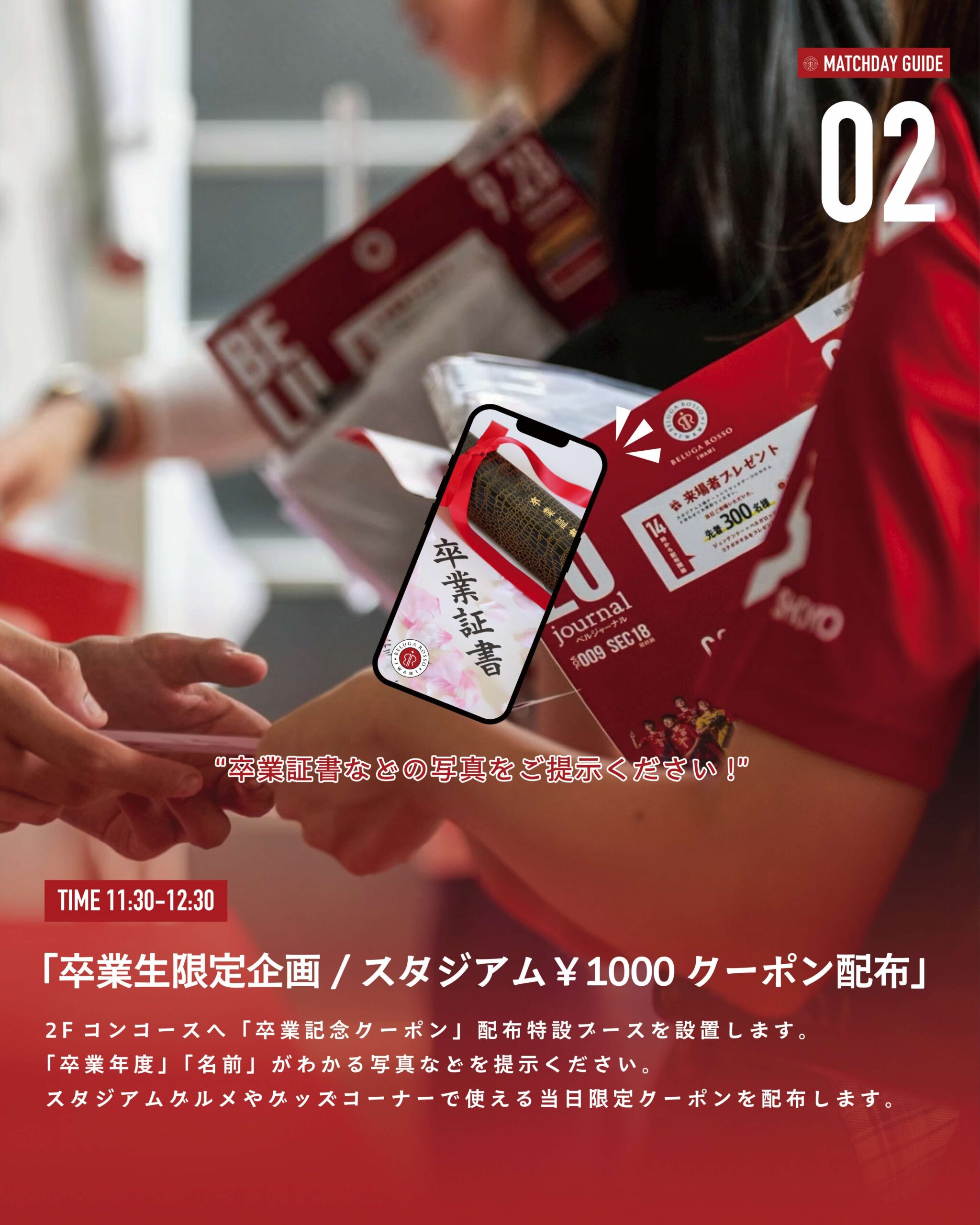 入場ゲートにでMDP(マッチデープログラム)「Belu journal 2026 vol.2」をお受け取りください。抽選番号が記載されています。